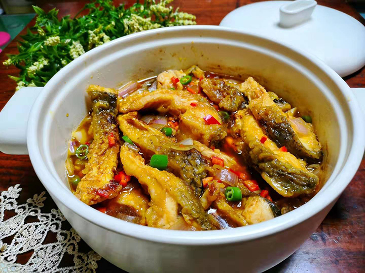 – Cho các miếng cá đã chiên vào, thêm gia vị, nước, đun khoảng 10 phút, tắt bếp, rắc thêm hành và ớt đỏ tươi.