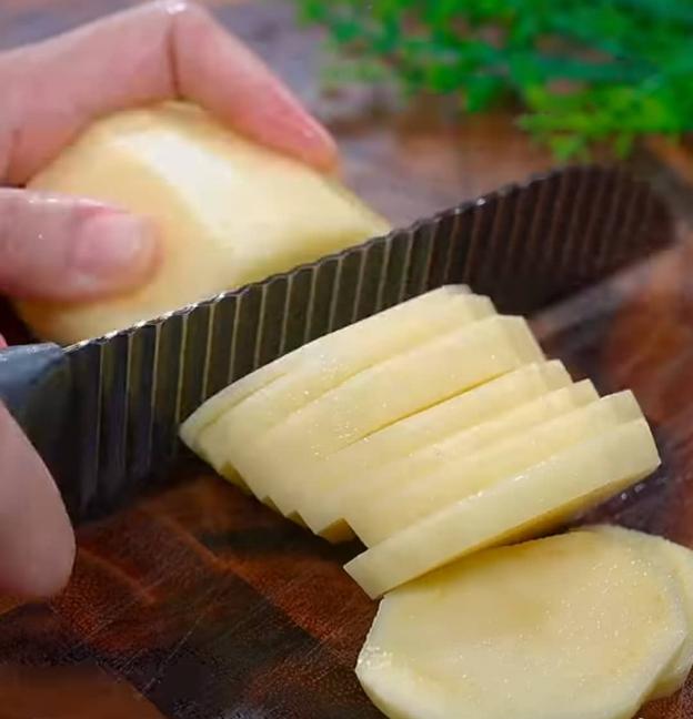Khoai tây bạn gọt vỏ, ngâm 5p trong nước muối pha loãng để sạch nhựa và chống thâm. Sau đó bạn rửa sạch với nước, để ráo rồi cắt thành các khoanh tròn dầy tầm 0,5 cm như hình hướng dẫn.